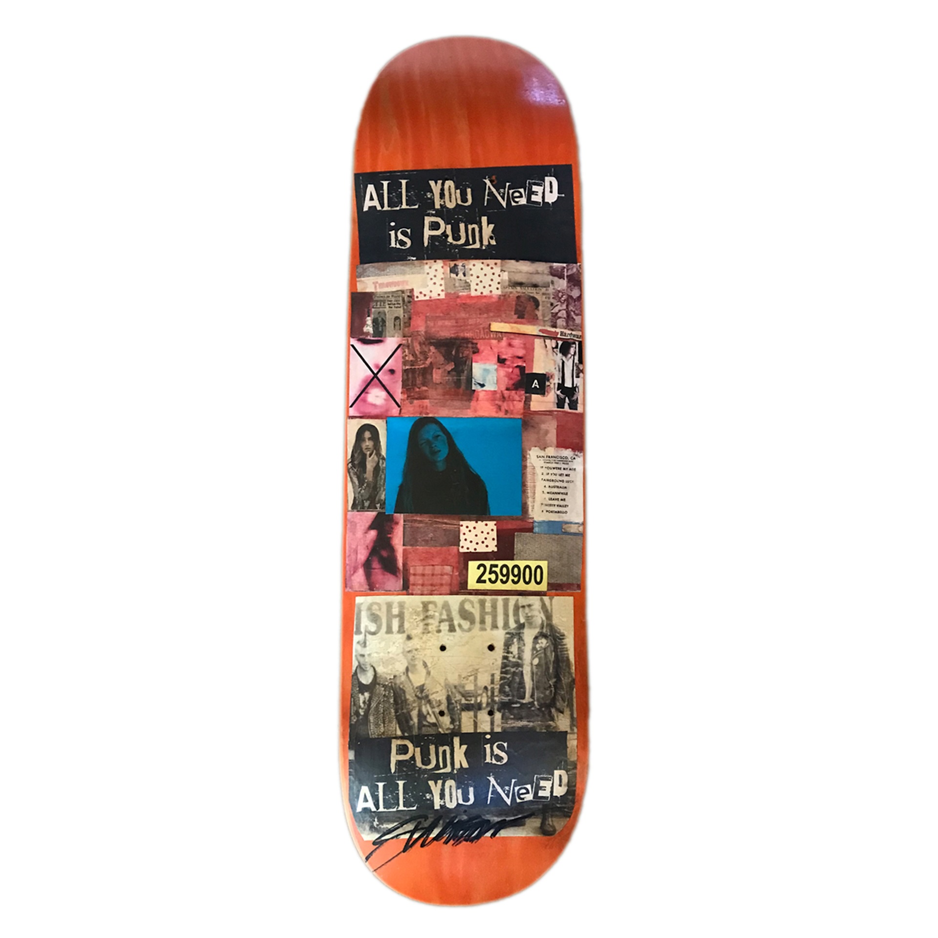 Acrylic Paint Spary Varnish and Collage on Skate Deck | 8″ x 31″ | 2020
