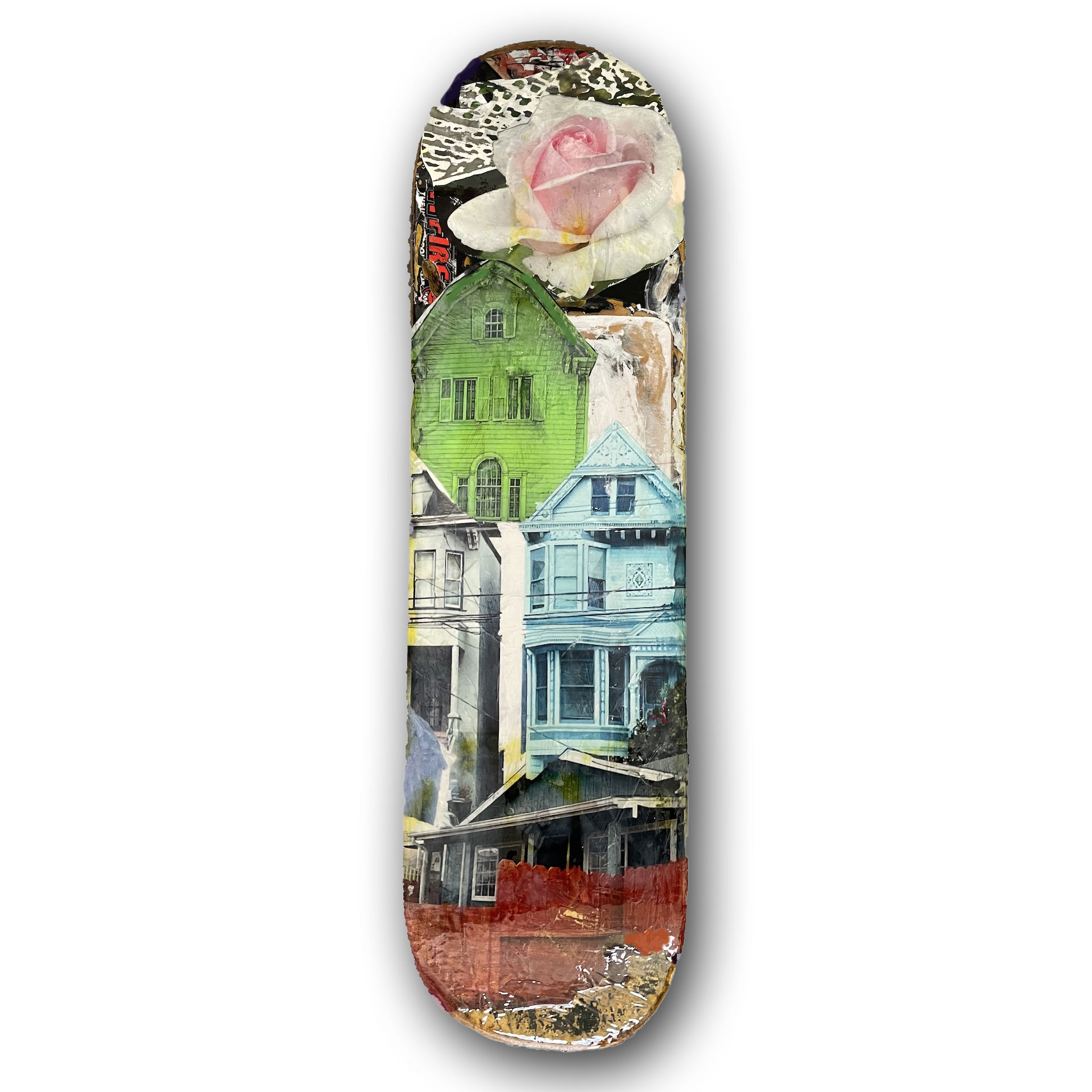 Mixed Media on Skate Deck | 8″ x 31″ | 2025