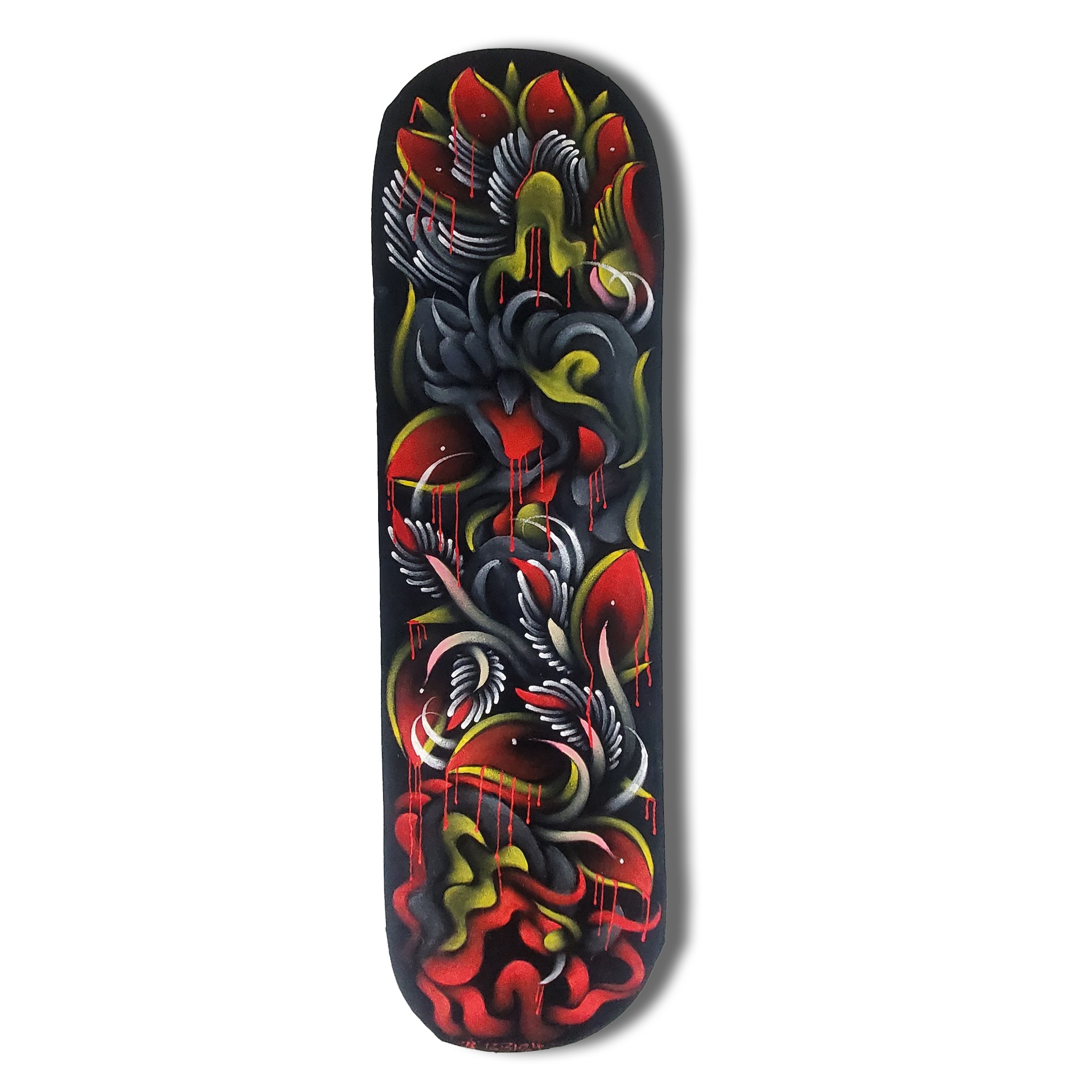 Acrylic on Black Velvet on Skate Deck | 8″ x 31″ | 2025