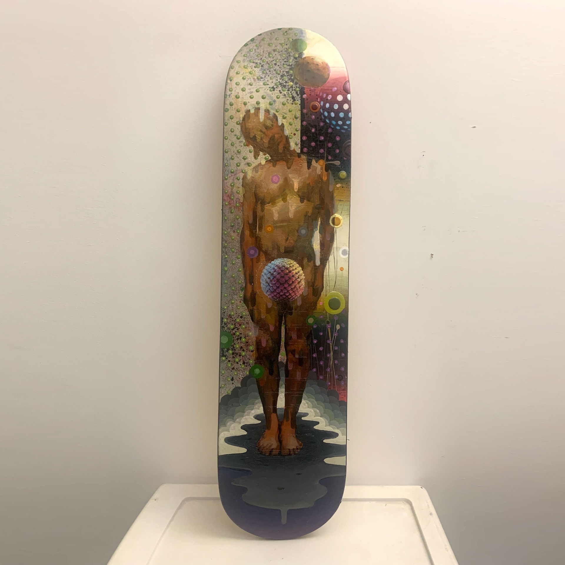 Acrylic and Oil on Skate Deck | 8″ x 31″ | 2025