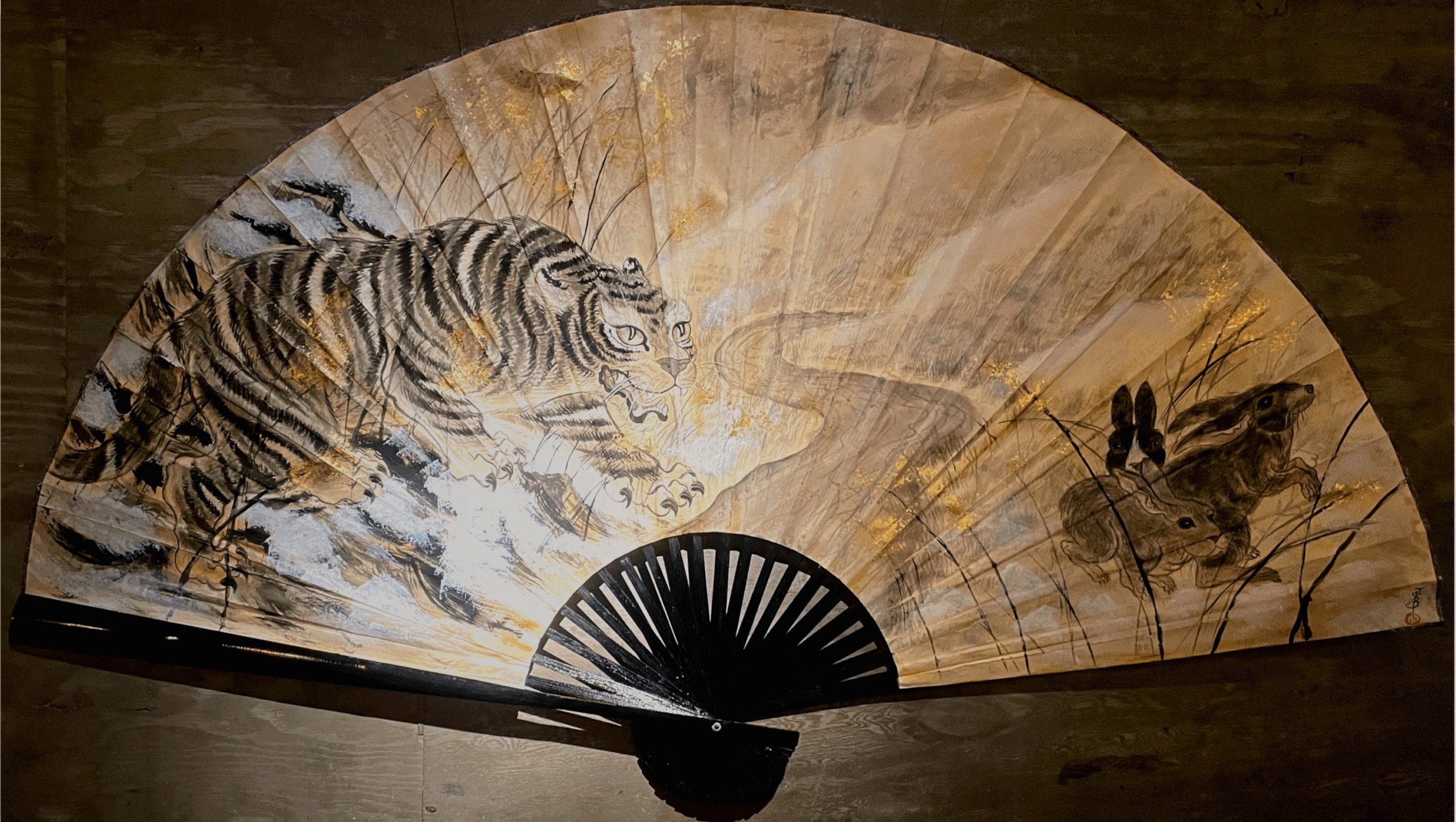 Sumi Ink and Gofun Pigment on Oversized Sensu Fan made of Bamboo and Washi Paper