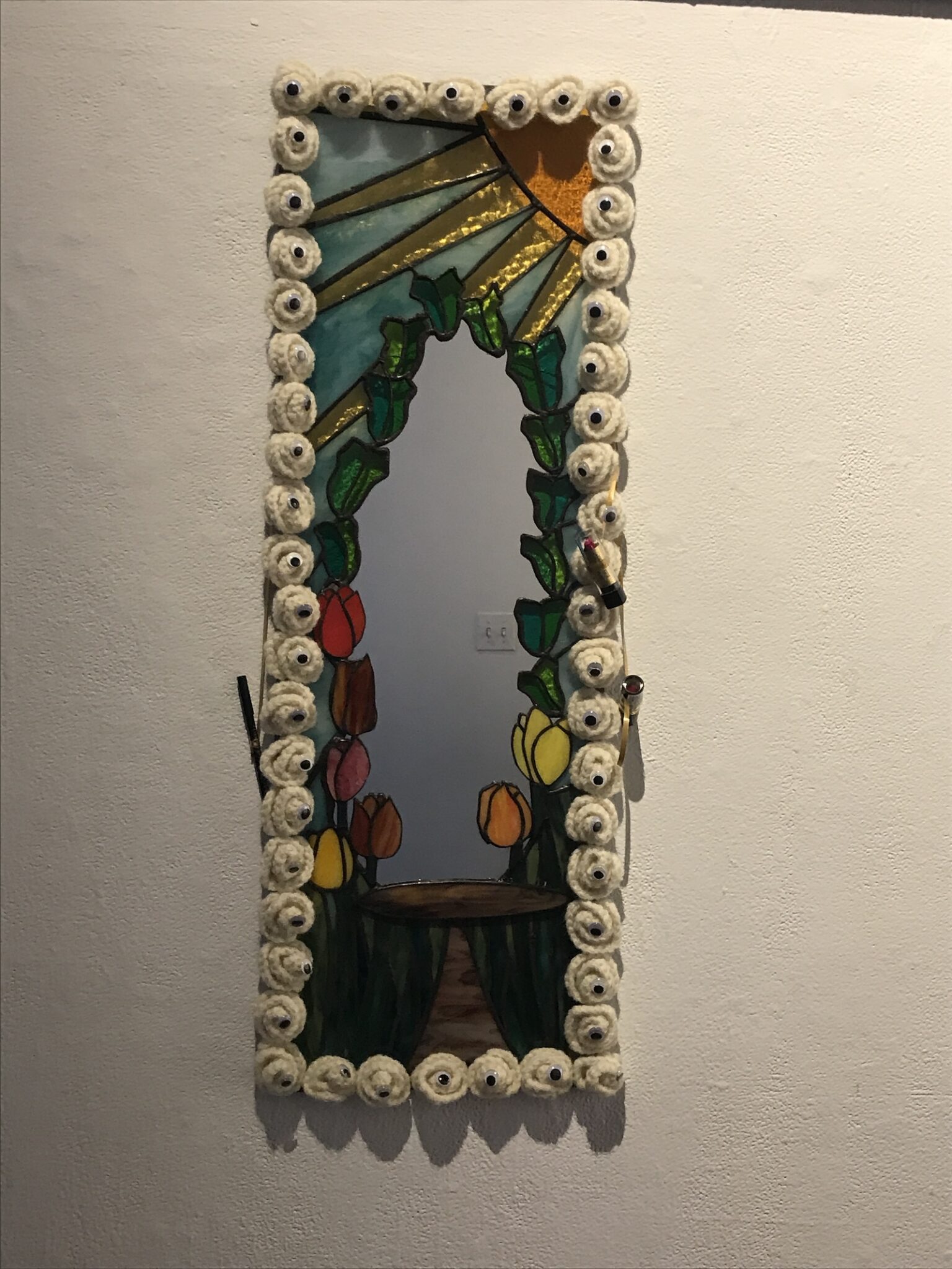 yarn, glass, googly eyes, copper foiled glass, mirror | Life Size | 2024